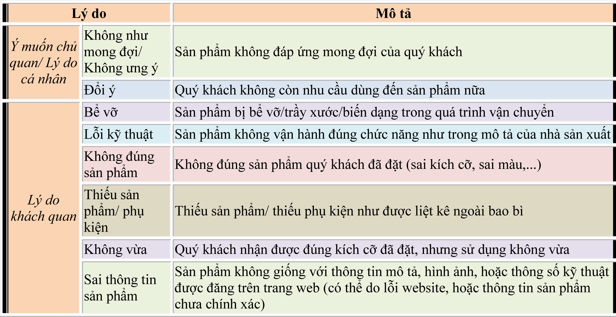 Quý khách có thể yêu cầu đổi trả sản phẩm trong đơn hàng của mình vì bất kỳ lý do gì.
